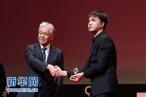 11月2日,在第31屆東京國際電影節(jié)頒獎典禮上,中國導演黃璜(右)在作品《武林孤兒》獲“亞洲未來”單元國際交流基金亞洲中心特別獎后上臺領獎。新華社記者 杜瀟逸 攝