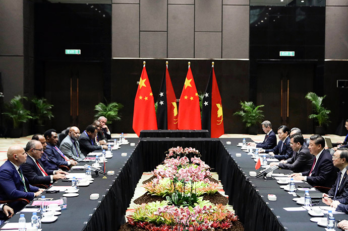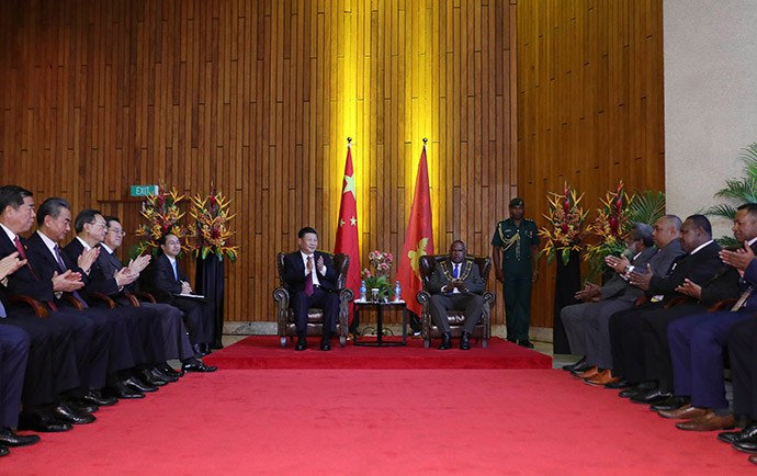 11月16日,國(guó)家主席習(xí)近平在莫爾茲比港分別會(huì)見建交太平洋島國(guó)領(lǐng)導(dǎo)人。這是習(xí)近平會(huì)見紐??偫硭P氯A社記者 丁林 攝