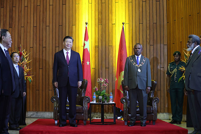 11月16日,國(guó)家主席習(xí)近平在莫爾茲比港會(huì)見巴布亞新幾內(nèi)亞總督達(dá)達(dá)埃。新華社記者 鞠鵬 攝