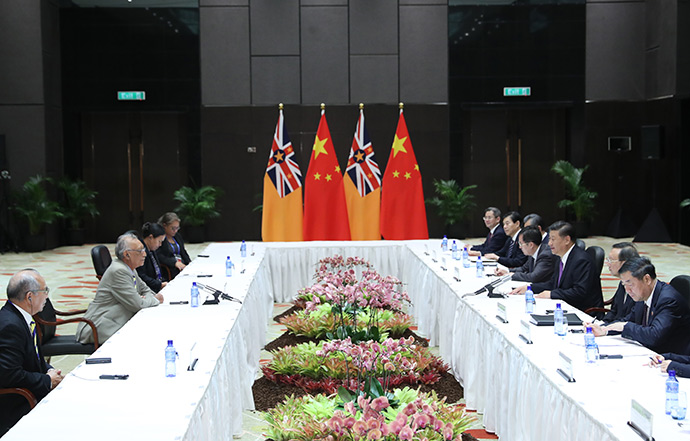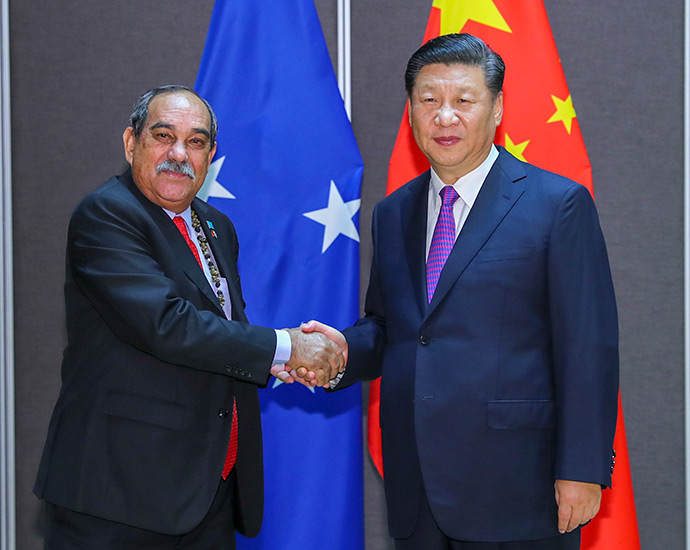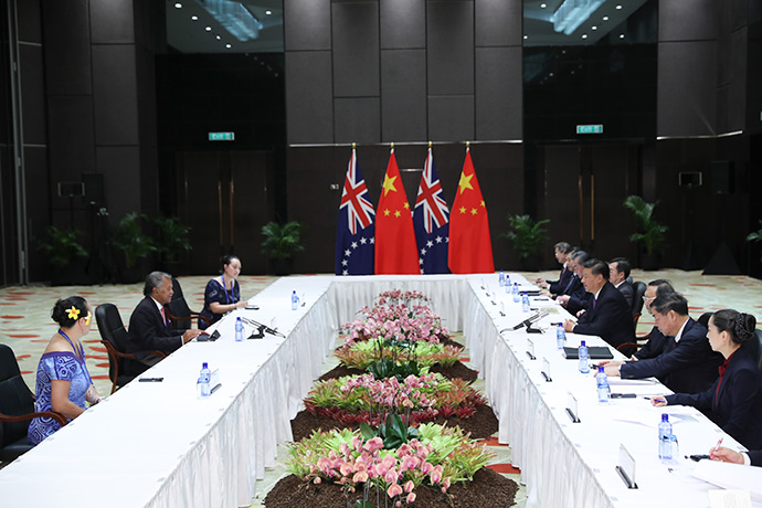 11月16日,國(guó)家主席習(xí)近平在莫爾茲比港分別會(huì)見建交太平洋島國(guó)領(lǐng)導(dǎo)人。這是習(xí)近平會(huì)見庫(kù)克群島總理普納。新華社記者 丁林 攝