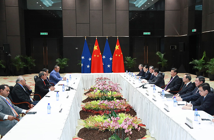 11月16日,國(guó)家主席習(xí)近平在莫爾茲比港分別會(huì)見建交太平洋島國(guó)領(lǐng)導(dǎo)人。這是習(xí)近平會(huì)見密克羅尼西亞聯(lián)邦總統(tǒng)克里斯琴。新華社記者 謝環(huán)馳 攝