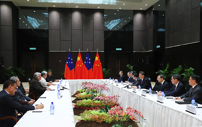 11月16日,國(guó)家主席習(xí)近平在莫爾茲比港分別會(huì)見建交太平洋島國(guó)領(lǐng)導(dǎo)人。這是習(xí)近平會(huì)見薩摩亞總理圖伊拉埃帕。新華社記者 謝環(huán)馳 攝