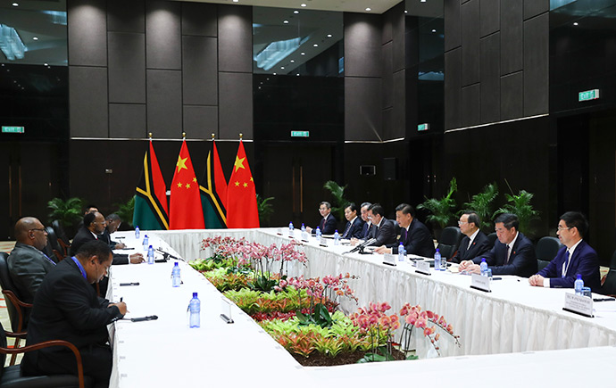 11月16日,國(guó)家主席習(xí)近平在莫爾茲比港分別會(huì)見建交太平洋島國(guó)領(lǐng)導(dǎo)人。這是習(xí)近平會(huì)見瓦努阿圖總理薩爾瓦伊。新華社記者 謝環(huán)馳 攝
