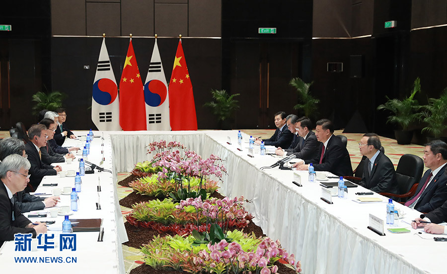 習(xí)近平指出,過去一年,我同總統(tǒng)先生達(dá)成的各項(xiàng)共識(shí)正得到有效落實(shí),兩國關(guān)系穩(wěn)步改善和發(fā)展。我們要不斷深化中韓戰(zhàn)略合作伙伴關(guān)系,共同為促進(jìn)地區(qū)持久和平和繁榮作出積極貢獻(xiàn)。雙方要繼續(xù)發(fā)揮好高層引領(lǐng)作用,尊重彼此核心利益和重大關(guān)切,加強(qiáng)溝通,建立和鞏固互信,繼續(xù)妥善處理好敏感問題。要重點(diǎn)推進(jìn)共建“一帶一路”,加快兩國自由貿(mào)易協(xié)定第二階段談判,推動(dòng)雙邊互利合作優(yōu)化升級(jí)。要加強(qiáng)在亞太經(jīng)合組織、二十國集團(tuán)、中日韓等多邊框架內(nèi)協(xié)調(diào)和合作。