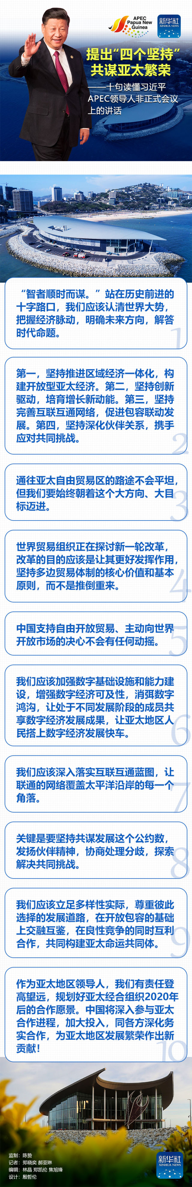 很高興同大家相聚在美麗的莫爾茲比港。亞太經(jīng)合組織成員領(lǐng)導(dǎo)人首次在太平洋島國(guó)地區(qū)聚首,圍繞“把握包容性機(jī)遇,擁抱數(shù)字化未來(lái)”的主題,回顧合作歷程,共商亞太愿景。我謹(jǐn)對(duì)巴布亞新幾內(nèi)亞政府特別是奧尼爾總理為籌備本次會(huì)議付出的努力,表示衷心的感謝!