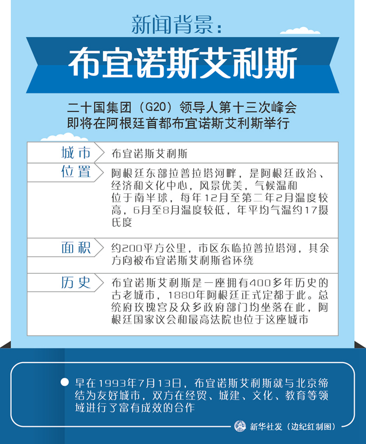 二十國集團(G20)領(lǐng)導人第十三次峰會即將在阿根廷首都布宜諾斯艾利斯舉行。布宜諾斯艾利斯位于阿根廷東部拉普拉塔河畔,是阿根廷政治、經(jīng)濟和文化中心,風景優(yōu)美,氣候溫和。