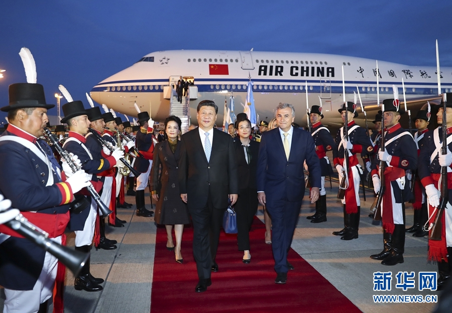當(dāng)?shù)貢r間20時05分許,習(xí)近平乘坐的專機(jī)抵達(dá)布宜諾斯艾利斯埃塞伊薩國際機(jī)場。習(xí)近平和夫人彭麗媛受到阿根廷外交部長福列、胡胡伊省省長莫拉萊斯等熱情迎接。儀仗隊長趨前致敬,軍樂團(tuán)奏響雄勁有力的進(jìn)行曲,習(xí)近平和彭麗媛沿紅地毯前行,禮兵分列紅地毯兩側(cè),行注目禮。