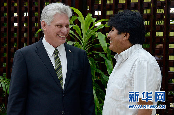 12月14日,在古巴哈瓦那,古巴國(guó)務(wù)委員會(huì)主席兼部長(zhǎng)會(huì)議主席迪亞斯-卡內(nèi)爾(左)在峰會(huì)開(kāi)幕前和玻利維亞總統(tǒng)莫拉萊斯交談。 新華社發(fā)(華金·埃爾南德斯 攝)