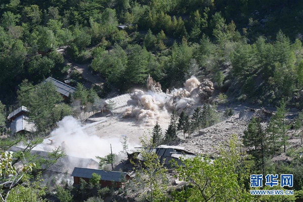 這是5月24日在朝鮮咸鏡北道吉州郡的豐溪里核試驗(yàn)場(chǎng)拍攝的場(chǎng)內(nèi)地面建筑爆破場(chǎng)景。朝鮮24日在豐溪里核試驗(yàn)場(chǎng)對(duì)多條坑道和附屬設(shè)施進(jìn)行爆破,并宣布正式廢棄這座核試驗(yàn)場(chǎng)。 新華社記者 程大雨 攝