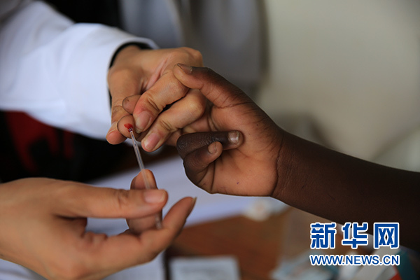 這張2018年12月8日拍攝的照片顯示,在馬拉維南部布蘭太爾市卡迪迪村衛(wèi)生院,第六批中國援馬拉維醫(yī)療隊(duì)醫(yī)生在義診活動中為當(dāng)?shù)鼐用駲z測瘧疾。新華社發(fā)(樊江波 攝)