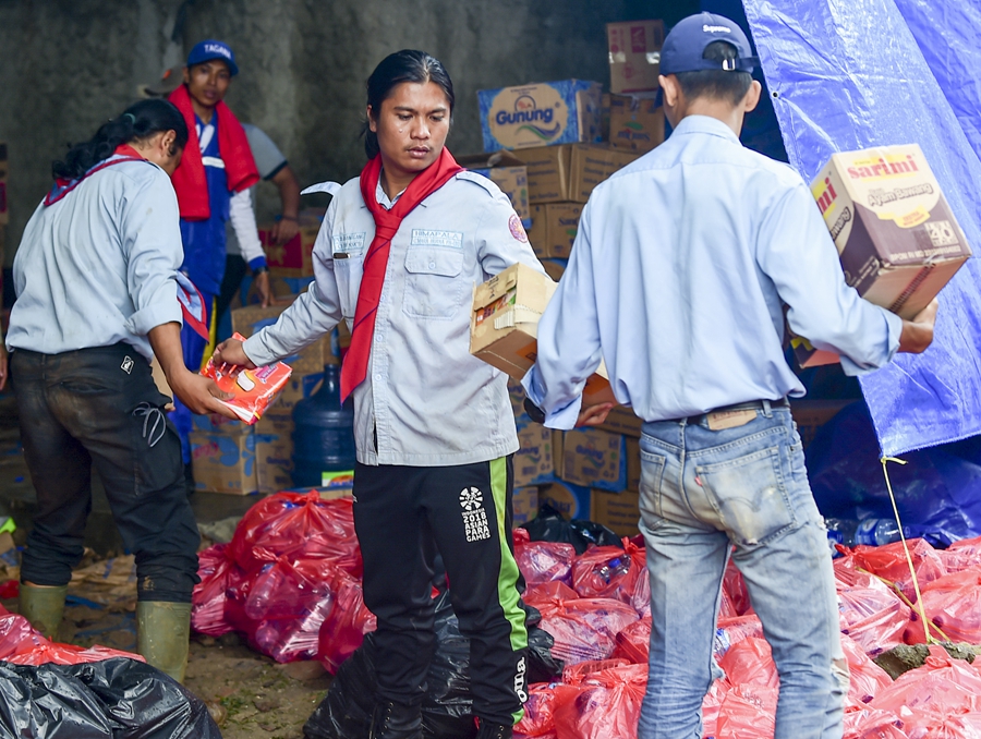 12月25日,在印度尼西亞萬丹省板底蘭縣的災(zāi)民安置點,參與賑災(zāi)的工作人員為災(zāi)民搬運食物。新華社記者杜宇攝