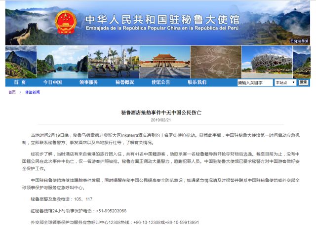 經初步了解,當時酒店有來自香港的旅行團入住,共有41名中國籍游客,劫匪殺害一名秘魯籍導游并搶奪財物后逃逸。截至目前為止,沒有中國籍公民在此次事件中傷亡,僅一名游客護照被搶。秘魯方面正調動大量警力,追剿犯罪人員。中國駐秘魯大使館已要求秘警方對中國游客做好安全保護工作。