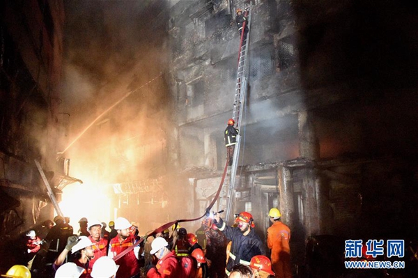 2月21日,在孟加拉國(guó)首都達(dá)卡,消防員在火災(zāi)現(xiàn)場(chǎng)救援。新華社發(fā)(薩利姆·禮薩 攝)