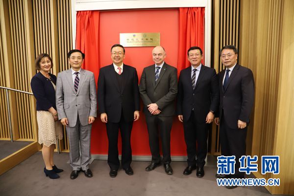 2月26日,在愛(ài)爾蘭首都都柏林,中國(guó)教育部副部長(zhǎng)田學(xué)軍(左三)、中國(guó)駐愛(ài)爾蘭大使岳曉勇(左二)和都柏林大學(xué)校長(zhǎng)安德魯?迪克斯(右三)等在都柏林大學(xué)示范孔子學(xué)院揭牌儀式上合影。