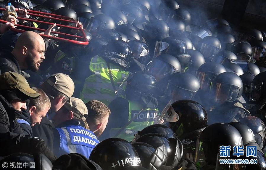 當地時間2019年3月9日,烏克蘭基輔,烏克蘭民族主義政黨的激進分子集會要求調查烏克蘭武裝部隊官員的腐敗問題,與警方發(fā)生激烈沖突。(圖片來源:視覺中國)