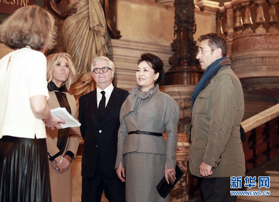 3月25日,國(guó)家主席習(xí)近平夫人彭麗媛在法國(guó)總統(tǒng)夫人布麗吉特陪同下參觀位于巴黎市第九區(qū)的法國(guó)巴黎歌劇院。 新華社記者 丁林 攝