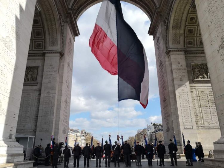 3月25日,巴黎碧空如洗,一面巨大法國國旗飄揚(yáng)在凱旋門前。新華社記者 蘭紅光 攝