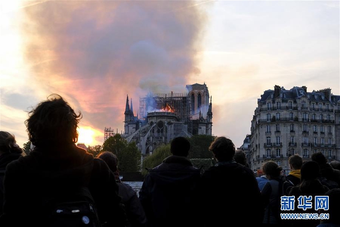 火災(zāi)現(xiàn)場(chǎng),有著800多年歷史的教堂被火光和濃煙籠罩。哥特式塔尖傾斜倒塌,成千上萬(wàn)的民眾站在河對(duì)岸或者通過(guò)電視直播目睹了這一幕。所有人表情凝重,很多人淚流滿面。