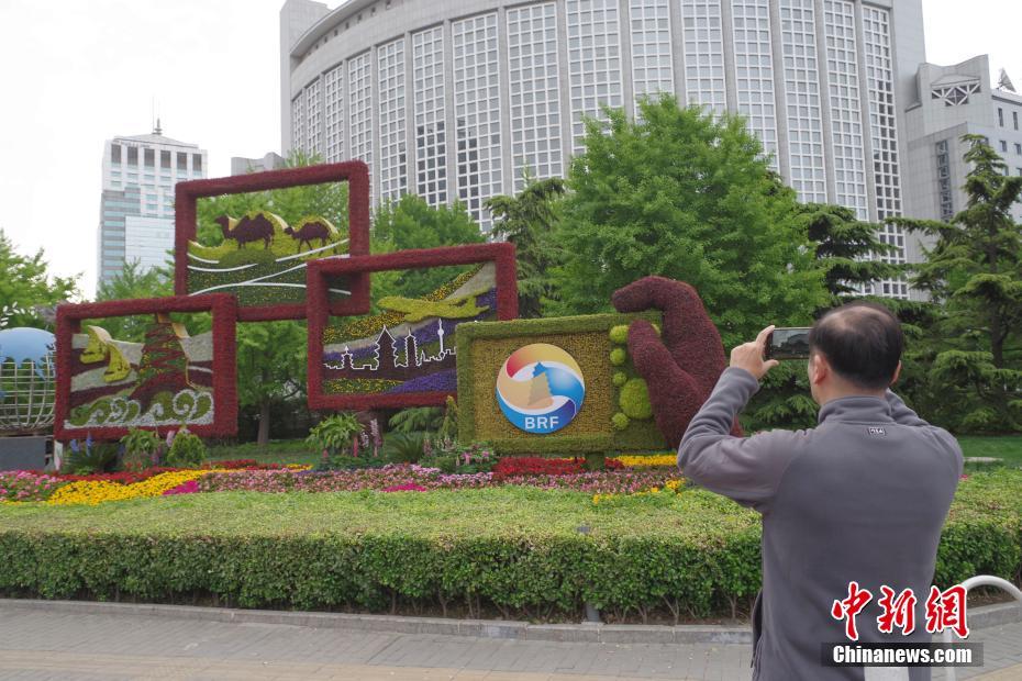 4月18日,北京朝陽門的“一帶一路”主題花壇吸引市民拍照。第二屆“一帶一路”國(guó)際合作高峰論壇即將在北京舉行,北京市內(nèi)布置了多個(gè)主題花壇迎接盛會(huì)。中新社記者 賈天勇 攝