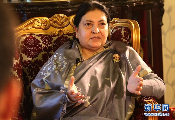 4月18日,在尼泊爾首都加德滿都總統(tǒng)府,尼泊爾總統(tǒng)比迪亞·德維·班達(dá)里接受中國(guó)媒體記者聯(lián)合采訪。新華社發(fā)(蘇尼爾·夏爾馬 攝)