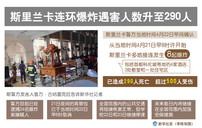 斯警方發(fā)言人魯萬·古納塞克拉告訴新華社記者,警方目前已經(jīng)逮捕24名爆炸案嫌疑人,21日夜間的宵禁也已于當?shù)貢r間22日早6時取消,全國范圍內(nèi)的公共交通將陸續(xù)恢復(fù)正常,但學(xué)校22日和23日繼續(xù)停課。