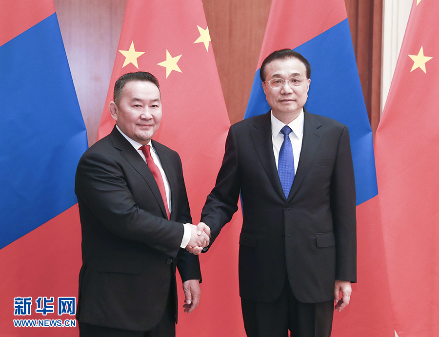 李克強(qiáng)表示,中蒙是山水相連的友好鄰邦。今年適逢中蒙建交70周年和《中蒙友好合作關(guān)系條約》修訂25周年,兩國關(guān)系迎來新的發(fā)展機(jī)遇。習(xí)近平主席將同總統(tǒng)先生舉行會(huì)談,規(guī)劃兩國關(guān)系下一步發(fā)展。中方愿同蒙方加強(qiáng)政治互信,尊重彼此核心利益和重大關(guān)切,推動(dòng)中蒙全面戰(zhàn)略伙伴關(guān)系再上新臺(tái)階。我們?cè)冈谙嗷プ鹬亍⑵降群献?、互利互惠的基礎(chǔ)上深化雙方務(wù)實(shí)合作,將“一帶一路”倡議同蒙方“發(fā)展之路”倡議對(duì)接,加快推進(jìn)中蒙自貿(mào)協(xié)定和經(jīng)濟(jì)合作區(qū),深化在農(nóng)業(yè)、產(chǎn)能、人文等領(lǐng)域的交流合作,繼續(xù)在邊境運(yùn)輸、口岸建設(shè)等方面為蒙方提供便利。