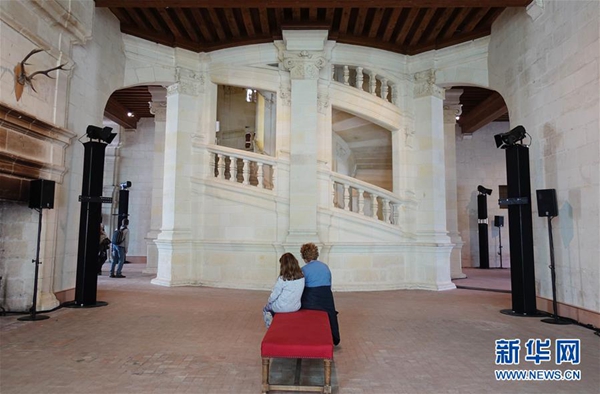 5月1日,游客在法國(guó)盧瓦爾河谷地區(qū)的香波堡參觀據(jù)稱來自達(dá)·芬奇構(gòu)思的雙螺旋樓梯。 新華社記者 高靜 攝