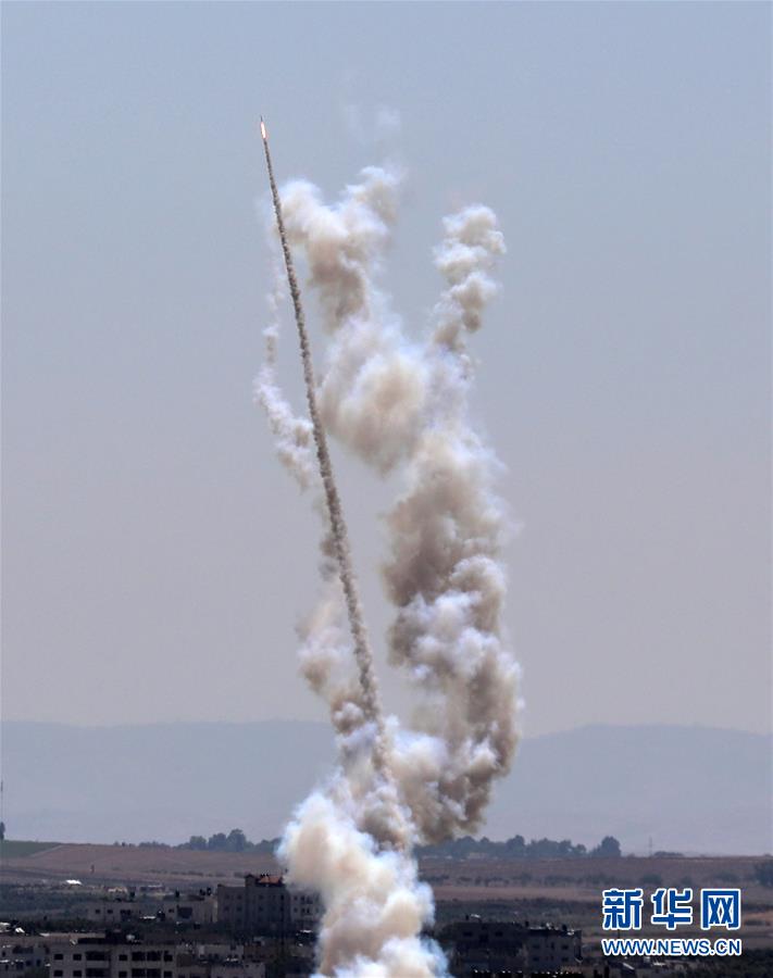 5月4日,一枚火箭彈從加沙地帶向以色列發(fā)射。新華社發(fā)(亞西爾 攝)