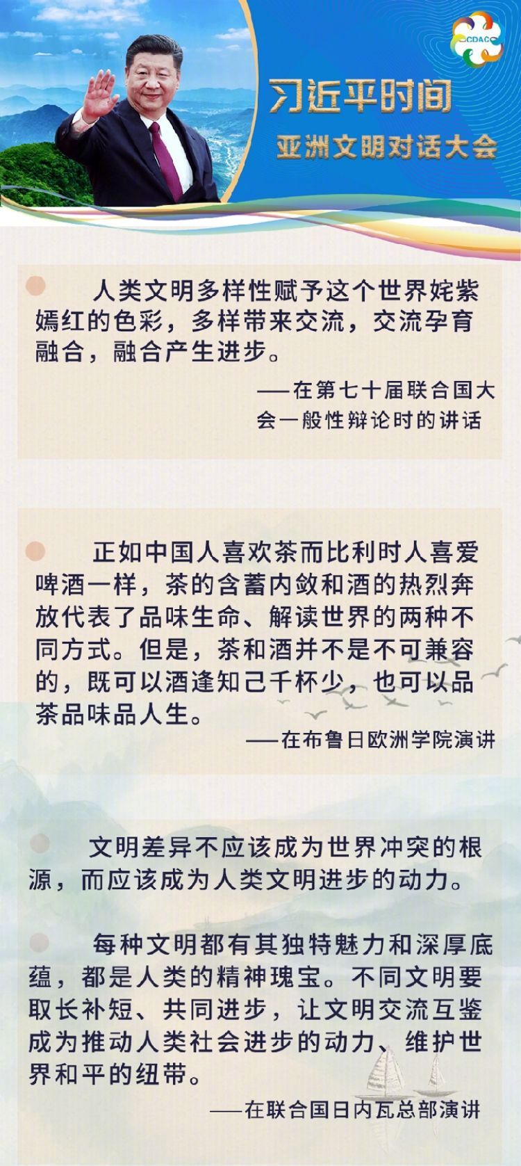 在這次演講中,習(xí)近平主席用生動的語言講明了對待不同文明應(yīng)有的態(tài)度和原則: