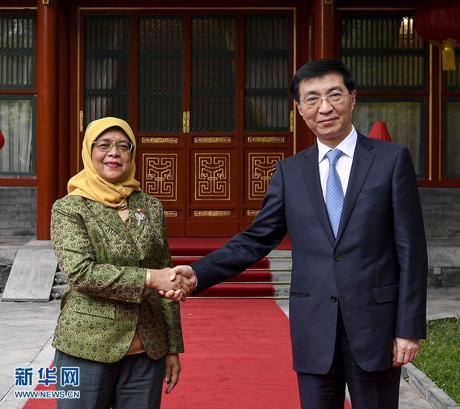 5月15日,中共中央政治局常委、中央書記處書記王滬寧在北京釣魚臺(tái)國賓館會(huì)見新加坡總統(tǒng)哈莉瑪。 新華社記者高潔攝