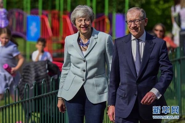 5月23日,在英國桑寧,英國首相特雷莎·梅(左)抵達(dá)投票站。新華社發(fā)(史蒂芬·程 攝)