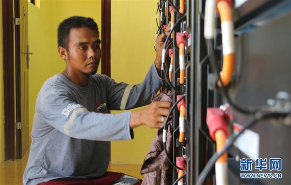 6月6日,在菲律賓北部偏遠山區(qū)的巴利瓦特村,村民迪奧內(nèi)斯托·埃斯特萬在太陽能發(fā)電站進行電力設備日常檢查和維護。新華社記者 鄭昕 攝