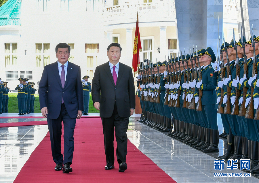 6月13日,國(guó)家主席習(xí)近平在比什凱克同吉爾吉斯斯坦總統(tǒng)熱恩別科夫會(huì)談。會(huì)談前,熱恩別科夫在阿拉爾恰國(guó)賓館會(huì)議中心前廣場(chǎng)為習(xí)近平舉行隆重歡迎儀式。這是兩國(guó)元首檢閱儀仗隊(duì)。 新華社記者 謝環(huán)馳 攝