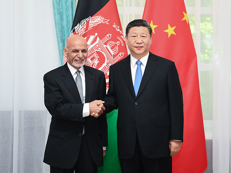 6月13日,國家主席習(xí)近平在比什凱克會見阿富汗總統(tǒng)加尼。新華社記者 謝環(huán)馳 攝