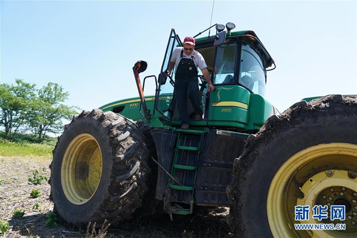 6月9日,在位于美國中部密蘇里州的小鎮(zhèn)奧里克,湯姆·沃特斯從一輛拖拉機(jī)上下來。新華社記者 劉杰 攝