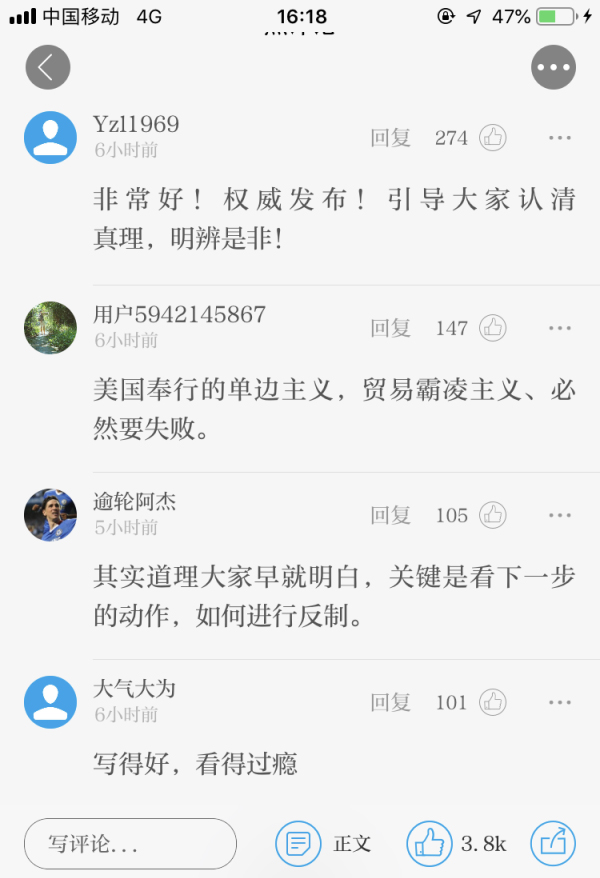 文章刊發(fā)后,網友紛紛轉發(fā)、點贊,表示“全面、清晰且深刻?!薄皺嗤l(fā)布!引導大家認清真理,明辨是非!”“美國奉行的單邊主義,貿易霸凌主義、必然要失敗。 ”