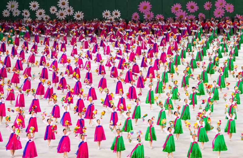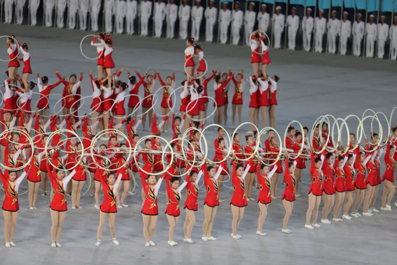 平壤大同江畔,綾羅島“五一”體育場是團(tuán)體操的主要舞臺。演出以朝鮮民族獨特的“歌舞之美”、富有活力的團(tuán)體操、嘆為觀止的雜技表演,展現(xiàn)出朝鮮革命與戰(zhàn)爭、政治和軍隊建設(shè)、民生與經(jīng)濟(jì)發(fā)展以及對外交往的宏偉畫卷。