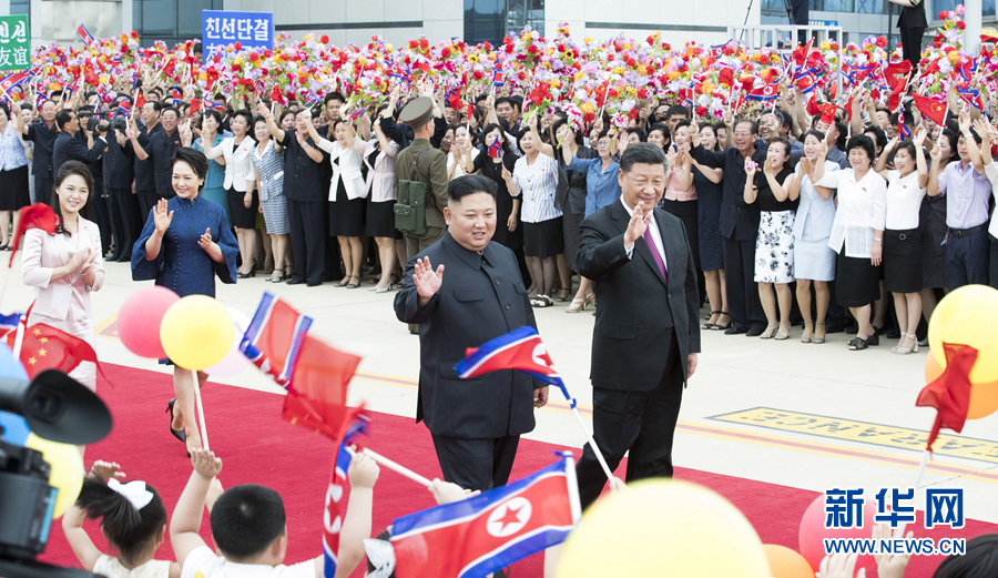 6月21日,中共中央總書記、國家主席習(xí)近平結(jié)束對(duì)朝鮮的國事訪問離開平壤回國。離開前,習(xí)近平和夫人彭麗媛出席朝鮮勞動(dòng)黨委員長(zhǎng)、國務(wù)委員會(huì)委員長(zhǎng)金正恩和夫人李雪主在機(jī)場(chǎng)舉行的歡送儀式。新華社記者 黃敬文 攝