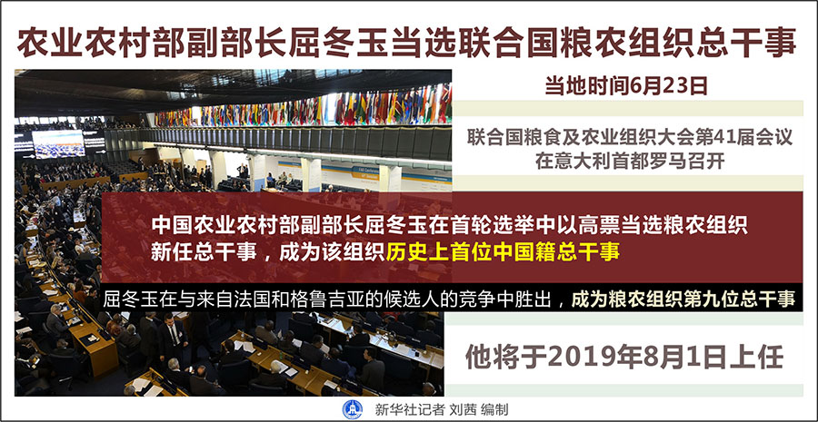 當日,屈冬玉在與來自法國和格魯吉亞的候選人的競爭中勝出,成為糧農組織第九位總干事。他將于今年8月1日上任。
