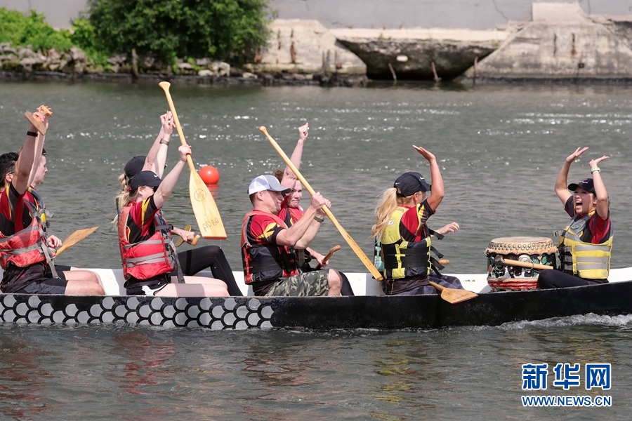 6月22日,由芝加哥華商會舉辦的第19屆芝加哥龍舟賽在中國城譚繼平公園舉行,這是參賽的隊員在比賽。記者 汪平 攝