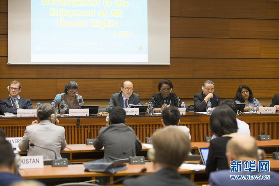 7月9日,在瑞士日內(nèi)瓦聯(lián)合國萬國宮,與會嘉賓出席“發(fā)展對享有所有人權(quán)的貢獻(xiàn)”主題邊會。新華社記者 徐金泉 攝