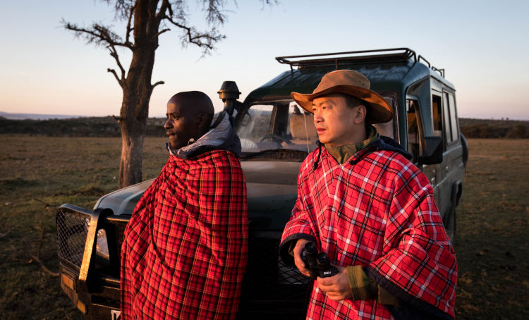 2018年7月7日,在肯尼亞馬賽馬拉大草原奧肯耶保護(hù)區(qū),星巴(右)和當(dāng)?shù)匮策墕T觀察情況。新華社記者呂帥攝