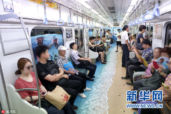 地下交通也得講究涼快。韓國釜山地鐵就曾設(shè)置了“海灘地鐵”車廂,將沙灘和波浪的美景帶進(jìn)車廂,為炎炎夏日中乘坐地鐵的乘客帶來一絲清涼。