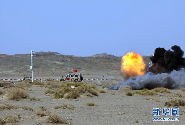 在“國際軍事比賽-2019”“安全環(huán)境”項(xiàng)目單組賽中,中國參賽隊(duì)快速通過雷爆區(qū)(8月8日攝)。新華社發(fā)(王軍強(qiáng) 攝)