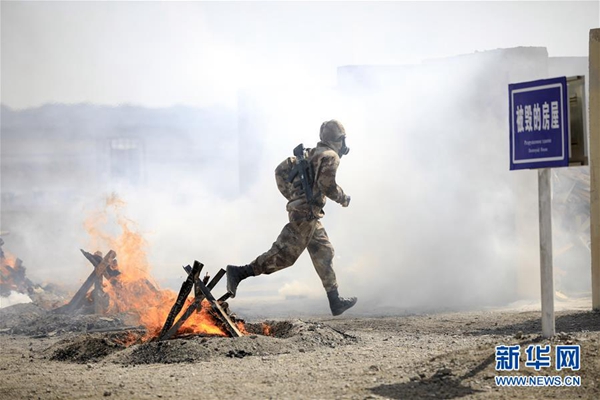 在“國際軍事比賽-2019”“安全環(huán)境”項(xiàng)目單組賽中,中國參賽隊(duì)員通過火障(8月8日攝)。新華社發(fā)(王鵬飛 攝)
