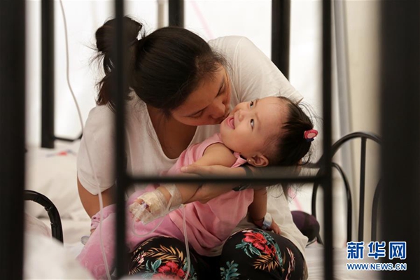 8月13日,在菲律賓甲米地省一處登革熱應(yīng)急醫(yī)療站,一名母親照顧自己患病的孩子。新華社發(fā)(魯埃勒·烏馬利 攝)