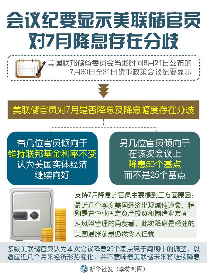 美聯(lián)儲當(dāng)天公布的7月30日至31日貨幣政策會議紀要顯示,有幾位官員傾向于維持聯(lián)邦基金利率不變,認為美國實體經(jīng)濟繼續(xù)向好;另幾位官員傾向于在該次會議上降息50個基點而不是25個基點,認為美聯(lián)儲應(yīng)采取更強有力的行動以更好解決過去幾年通脹低迷的問題。