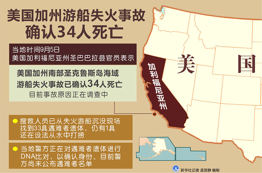 新華社洛杉磯9月5日電(記者譚晶晶 高山)美國加利福尼亞州圣巴巴拉縣官員5日表示,美國加州游船失火事故已確認(rèn)34人死亡。目前事故原因正在調(diào)查中。