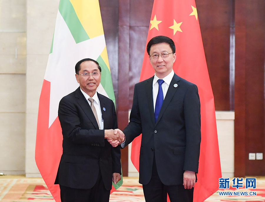 9月20日,中共中央政治局常委、國務(wù)院副總理韓正在廣西南寧會見出席第十六屆中國—東盟博覽會和中國—東盟商務(wù)與投資峰會的緬甸副總統(tǒng)敏瑞。 新華社記者 申宏 攝
