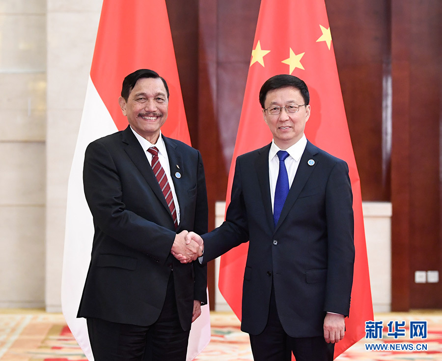 9月20日,中共中央政治局常委、國務(wù)院副總理韓正在廣西南寧會見出席第十六屆中國—東盟博覽會和中國—東盟商務(wù)與投資峰會的印尼總統(tǒng)特使、海洋統(tǒng)籌部長盧胡特。 新華社記者 申宏 攝